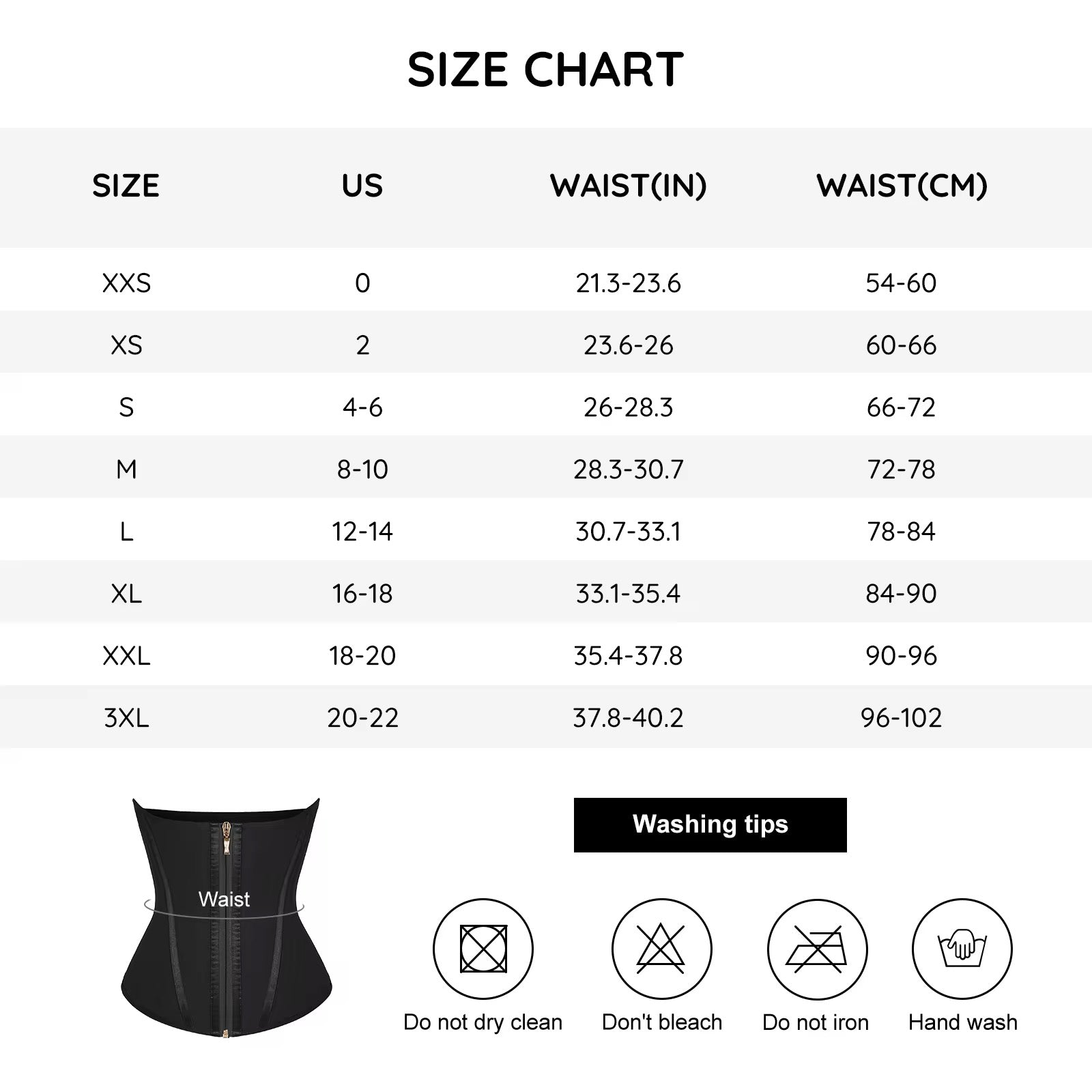 This corset shaper is designed with 15 steel ribs for structured support and long-lasting shape retention, enhanced by a sleek and secure gold zipper front closure.
